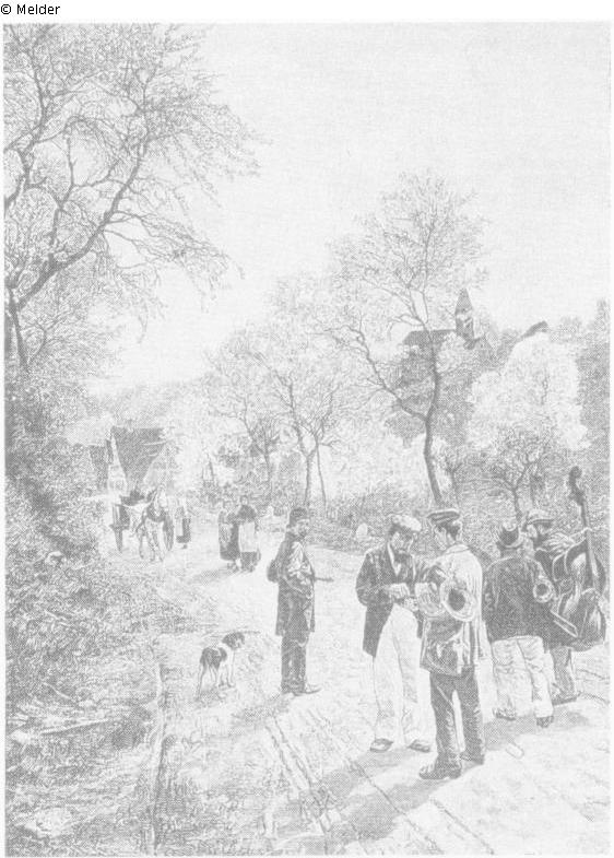Vier Musikanten ziehen auf ein Dorf zu, von denen einer einem entgegenkommenden Mann Schnupftabak anbietet, die Bäume stehen in voller Blüte, im Hintergrund rechts die Kirche; Rahmen: Außenmaße: 120 x 104 cm