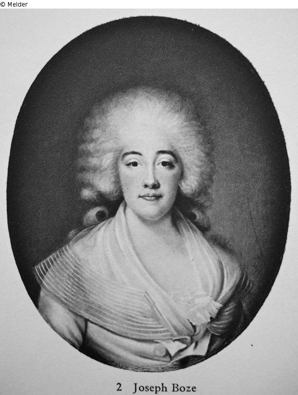 (Helbing: Brustbild einer jungen Frau mit gepudertem Lockenhaar, in weissem ausgeschnittenem Kleid, rechts bez.: Boze ft, G.R.) weisse Perücke, mit Schultertuch, tiefes Dekolleté