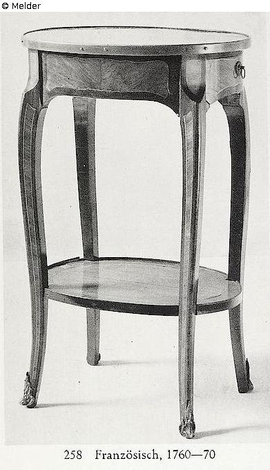 Palisander- und Rosenholz, Eiche gefüttert, mit Fadeneinlage. Auf geschweiften Beinen Zwischenplatte; seitliches Schubfach. Bronzenschuhe und -Rand. Quelle: Hugo Helbing Kunsthandlung und Kunstversteigerungshaus: Kunstbesitz eines Berliner Sammlers. Katalog Nr. 49. (DOI: Externer Link)