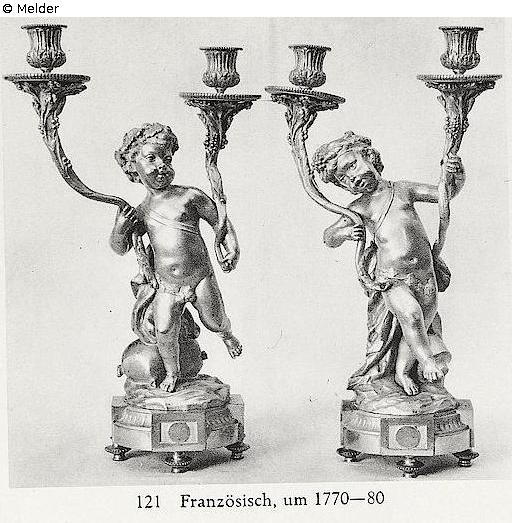 Bronze ziseliert und feuervergoldet. Auf abgekantetem Rundsockel mit Füßen ein weinbekränzter Putto, in jeder Hand eine gewundene füllhornförmige Rebenranke mit Leuchtertülle. Quelle: Hugo Helbing Kunsthandlung und Kunstversteigerungshaus: Kunstbesitz eines Berliner Sammlers. Katalog Nr. 49. (DOI: Externer Link)