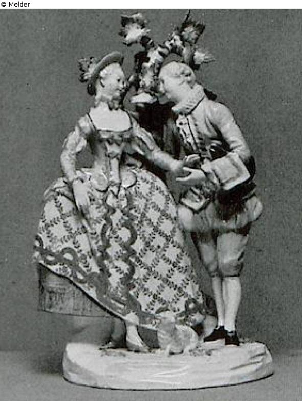 Paar in spanischer Schäfertracht. Stehend vor belaubtem Baumstamm. Die Dame rafft mit der rechten Hand leicht den reich gemusterten und mit Gold besetzten Rock, unter dem der kupfergrüne Reifrock sichtbar wird. Ihre purpurne Taille hat geschlitzte Ärmel und grüne Schleifen. Das hellpurpurne Kostüm des Schäfers hat geschlitzte Kniehosen und hellgrünen Besatz. Vor beiden liegt ein Lamm am Boden. Blüten und Blätter auf dem weißen Sockel sind wie der Baumstamm bunt staffiert. Leichte Reparaturen. Unterglasurblauer Bindenschild. Eingepreßt R. Wien