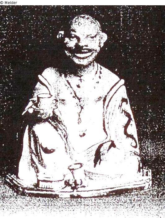 Schnorr von Carolsfeld: Pagode, Gleiches Modell wie Nr.1-3 und 5-10 (Schnorr von Carolsfeld). Auf polygonaler, vorn abgerundeter Sockelplatte. Auf der flachen rechten Hand eine golden staffierte Tasse. Am Sockel vorn achteckige Deckeldose, Kelchglas und Tonpfeife, die beiden ersteren golden staffiert. Die oberen Lider, die Nasenlöcher und Lippen rot, die Haarbüschel hinter den Ohren, die Brustwarzen und der Nabel golden staffiert. Auf dem Schädel ein goldener Krebs, am Hals eine kleinere und zwei größere Ketten mit Anhängern in Gold. Am Gewandausschnitt um Schultern und Leib eine doppelte Goldlinie. Der Ärmelbesatz graulila. Auf den Ärmeln Stern und Tausendfüßler, an den Beinen Halbmond und Delphin in Eisenrot. Sockelrand vergoldet, daneben eisenrote Wellenlinie. Um 1710-20. Ohne Marke.