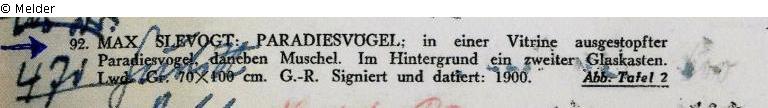 „Zwei Vitrinen, wahrscheinlich aus einem naturkundlichen Museum, zeigen ausgestopfte Paradiesvögel. Vor der ersten ist noch eine Trompetenmuschel platziert. „Tief in den Regenwäldern der großen Insel Neuguinea leben die „schönsten und außergewöhnlichsten gefiederten Bewohner der Erde“ schrieb der berühmte britische Naturforscher Alfred Russel Wallace, als er Mitte des 19. Jahrhunderts auf seiner Südostasien-Reise zum ersten Mal Paradiesvögel beobachtete. Kein Tier der Welt veranstaltet einen so feurigen Balztanz wie das Paradiesvogel-Männchen. Diese schillernden Exoten sind mit unseren Krähen verwandt“. (UW) „Eines der schönsten Bilder (der) letzten Münchner Zeit (…) sind die ‚Paradiesvögel’ von 1900, ein Juwel der stattlichen Reihe bester Werke Slevogts, welche die Sammlung Fuchs besitzt“, schreibt W. von Alten im „Kunstblatt“ von 1926.