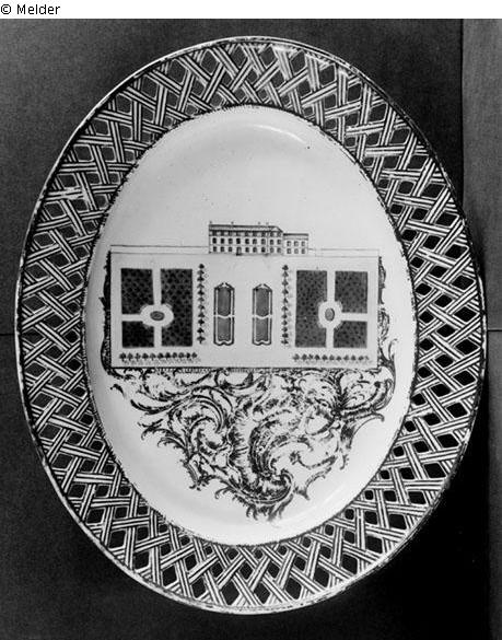 ovale Platte (Unikum); im Spigel DArstellung der Porzellanfabrik Frankenthal; Blaumarke Löwe, Pressmarke JH; Durchmesser: 34;28; Durchmesser: 34;28