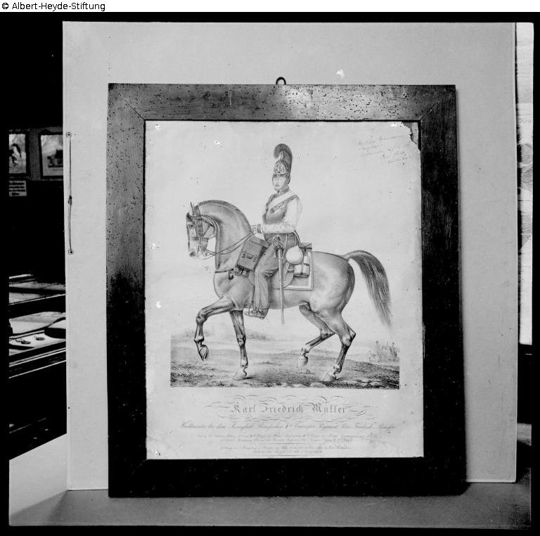 In schlichtem Holzrahmen das Bildnis des Karl Friedrich Müller, hoch dekorierter Wachtmeister im 1. preußischen Kürassier-Regiment. Darstellung zu Pferde von links. Unterhalb eine Legende zu Lebenslauf und Auszeichnungen. Oben rechts eine handschriftliche Erklärung zur Übergabe an das Luckenwalder Heimatmuseum.