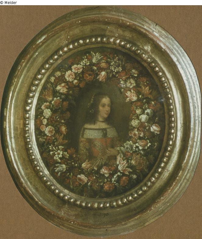 Weibliches Porträt mit Oberkörper und Hand. Blick nach rechts. Langes dunkles Haar, rotes Spitzenkleid mit weißem, umgeschlagenen Spitzenkragen. Blumen im Haar, enge Halskette und Ring am Finger. Umrahmt von Blumenkranz aus diversen Sommerblumen. Auf dem Rahmen Jahreszahl 1590.