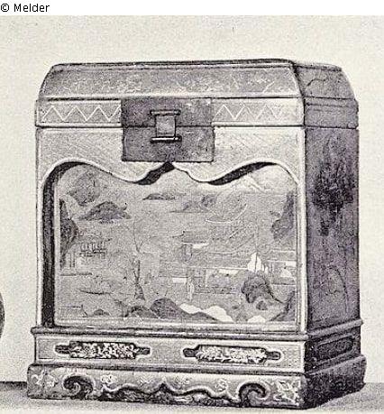 mit aufklappbarem Deckel und Verschlußbrett, innen 3 Schubladen. Auf stumpfem Rotlackgrund in bunter Lackmalerei und Gold Blütenzweige mit Vögeln und figürlichen Darstellungen in Wasserlandschaft. Beschläge und Griffe in Bronze. China. Kien-Lung.