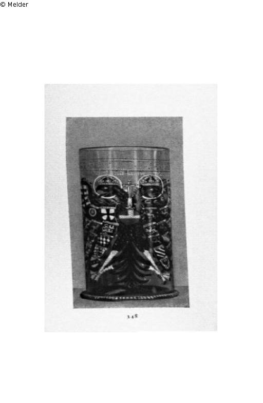 Glas (farblos) & bemalt (Emailfarbe). Auf der Wandung der Doppeladler mit den Quartenionenwappen auf den Flügeln, darüber die Inschrift: "Das Heilige Römische Reich mit sampt (!) Seinen Gliedern. 1606. Gott mein Trost." Am Lippenrand Borte aus blauen, weissen und grünen Punkten und Resten von Gold. Sachsen.