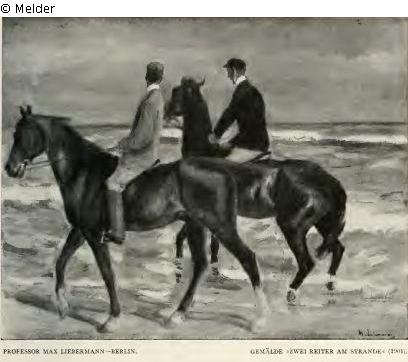 Eberle: "Zwei Reiter in Sportkleidung, der eine in grauer, der andere in schwarzer Jacke, reiten auf dem Sandstrand an der Meeresbrandung entlang. Der Braune im Vordergrund schreitet ruhig aus, der Reiter wendet sich nach rechts, wo der Fuchs seines Begleiters nervös im Wasser tänzelt. [...] Bez. rechts unten M. Liebermann 1901. [nachdatiert]"