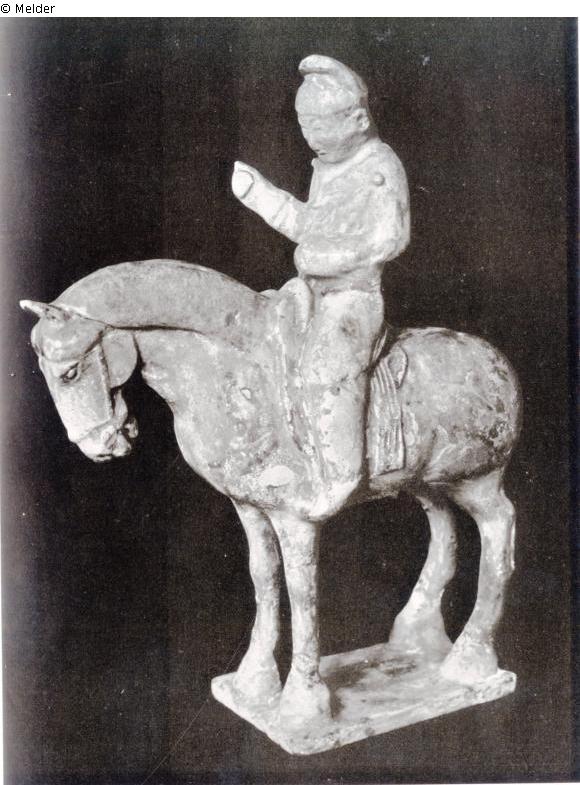 Sammlung Eduard Fuchs erworben zwischen 1912-1922 und in dessen Besitz dort bis 1933; 25.10.1933 Beschlagnahmung durch die Gestapo; zwangsweiser Verkauf (Zahlung Reichsfluchtsteuer) durch seine Tochter Gertraud Fuchs: Versteigerung Auktionshaus Rudolph Lepke Berlin, Katalog 2115, S. 9 - am 15.10 und am 16.10.1937 wurde diese Skulptur unter Nr. 72 versteigert: „TONFIGUR. Reiter zu Pferde: weißlichgelb glasiert, Höhe 31 cm. Tang (Abbildung Tafel 3)“. Laut annotiertem Lepke-Katalog (Kunsthistorische Bibliothek, Den Haag) von dem Lepke-Kommissionär G. Albrecht, Hindenburgdamm 3, Berlin-Lichterfelde ersteigert für 92,- RM (Schätzpreis 50,- RM). Die Protokollabschrift der Versteigerung 2115 bei der Reichskammer für Bildende Künste vermerkt maschinenschriftlich mit dem Namen „Jacal“, welcher Käufer real dahinter stand und bestätigt den Preis von 92,- RM (Landesarchiv Berlin, A Rep. 243-04 Reichskammer für bildende Künste – Landesleitung Berlin); Verbleib unbekannt
