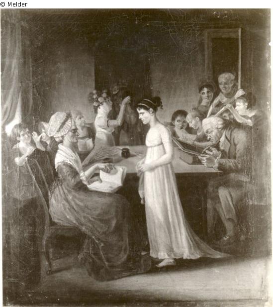 eines von vier gekauften Bildern, Schulunterricht in einer modischen Pensionsanstalt bei einer alten hässl. ... Der alte Rechenmeister wird von den Kindern verspottet. An der Stubentür sieht man den Friseur, der einer Schönen ein Bilett-doux zusteckt. In schwarzen glatten Rahmen, der Innen eine Goldborte und auf den flache aufgelegte Holzquadrate, Neuerwerbungen des Märkisches Museum. Kulturgeschichtliche und stadtgeschichtliche Erwerbungen Herbst 1937 bis Weihnachten 1938 XI, Berlin 1939, S. 28