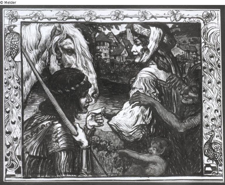 Bezeichnet rechts oben: A. Jank 96. Abgebildet in der "Jugend" 1896, S. 513 mit folgendem Text: Ein schönes Weib - hat den Teufel im Leib; Im Herzen den Tand - den Mann in der Hand.