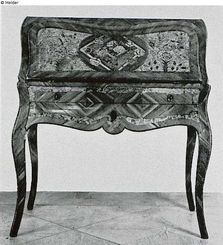 mit Marketerie, auf geschweiften Beinen, mit konturierter Zarge. Unter- und Oberteil geschweift. Die Marketerie aus Wurzelmaser, Pflaumenbaum- und anderen farbigen Hölzern zeigt auf der Klappe Blumensträuße in drei Feldern. Rückseite furniert. Deutsch, um 1760. H. 103 cm, Br. 92 cm, T. 54 cm. Literatur: Auktionskatalog Hans W. Lange, Wertvolles Kunstgewerbe, Berlin, 19.-21. Mai 1941, S. 25. Nr. 81, Taf. 12 (DOI: Externer Link)