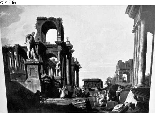 Links hochstrebende Architektur mit Herkulesbildwerken, rechts Reste einer Tempelfassade und Bogenarchitektur, Mitte Sarkophag. Reiche Figurenstaffage. Goldrahmen. Ausgestellt als Leihgabe im Kaiser-Friedrich-Museum Berlin 1931/1932.