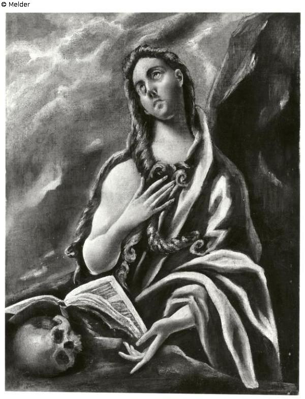 Den Kopf ein wenig nach links zur Seite geneigt, die Augen himmelwärts gerichtet. In gelbem Gewand. Das braune Haar gelöst, über die rechte entblößte Schulter und Brust herabfallend; die linke bedeckt mit einem gelben Gewand. Der rechte Arm erhoben und an die Brust gewinkelt, die rechte Hand weist auf ein vor ihr aufgeschlagenes Buch und Totenkopf. Hinter ihr rechts schroffe Gebirgswand, links klarer Himmel. Höchstwahrscheinlich eine Kopie, obwohl die Galerie einen sehr hohen Schätzwert angegeben hat; Nachkriegsexperten deuteten alle auf die Werkstatt von El Greco hin. Unsigniert.