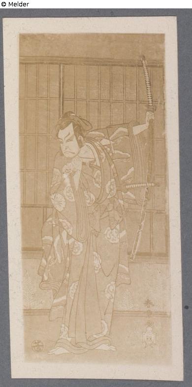 Schauspieler Matsumoto (Pinie) Hachizo steht in der Rolle eines Samurai. Ein Schwert steckt im Gürtel, das andere hält er mit dem ausgestreckten linken Arm hoch. Angedeuteter Innenraum mit Papierfenstern. Hinweis auf einen Namen "Pinie" im Muster des Gewandes wie im Dekor unter dem Fenster. Signiert mit dem Vasensignet in archaischer Schrift: Hayashi = Wald. Hosoye (Schmalbild, aufrechtes Format)
