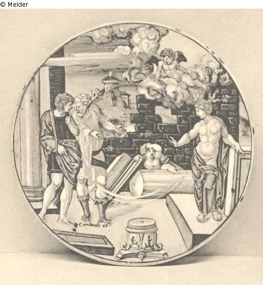 A BRILLIANTLY PAINTED URBINO PLATE, by Fra Xanto Avelli, decorated with the subject of King Candaules displaying his wife to Gyges, one of his ministers, in the centre Cupid and a broken column, another putto in the clouds above and a castle in the distance through a broken brick wall, the reverse inscribed in black " 1537 Nostra Candauli Re sua Donna a Gigio, F.X.R. "