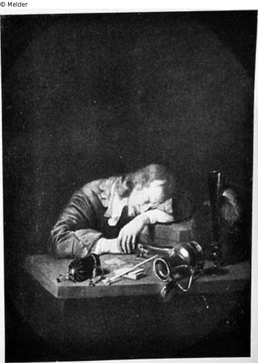 Hinter einem Tisch, auf dem Hut, Glas, umgeworfene Kanne, Pfeife und Tabaksbeutel verstreut sind, ein sitzender Mann, der, den Kopf in die Arme gelegt, schläft. Dunkler Hintergrund. Goldrahmen.