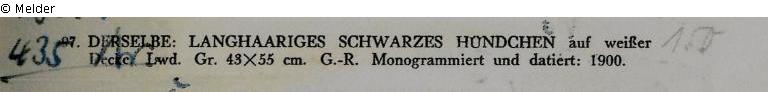 Sammlung Eduard Fuchs bis 1933; 25.10.1933 Beschlagnahmung durch die Gestapo; Versteigerung Auktionshaus Rudolph Lepke, Berlin, Katalog 2114, S. 13. Am 16. und 17.06. 1937 wurde das Gemälde als Nr. 97: „Lang-haariges schwarzes Hündchen auf weißer Decke. Lwd. Gr. 43 x 55 cm. G.-R. Monogrammiert und datiert: 1900“ versteigert; ersteigert von dem Lepke-Kommissionär Carl Braunstein (Berlin-Lichtenrade, Straße 6a Nr. 25) für 265,- RM (Schätzpreis: 150,- RM); Sammlung Georg Schäfer, Schweinfurt; angeboten am 27.02. 1999 als Lot 299 (Abbildung S. 199) bei Galerie Neumeister, München (nicht versteigert); angeboten am 05.06.2004 auf Auktion Lempertz, Köln (nicht verkauft); Verbleib unbekannt