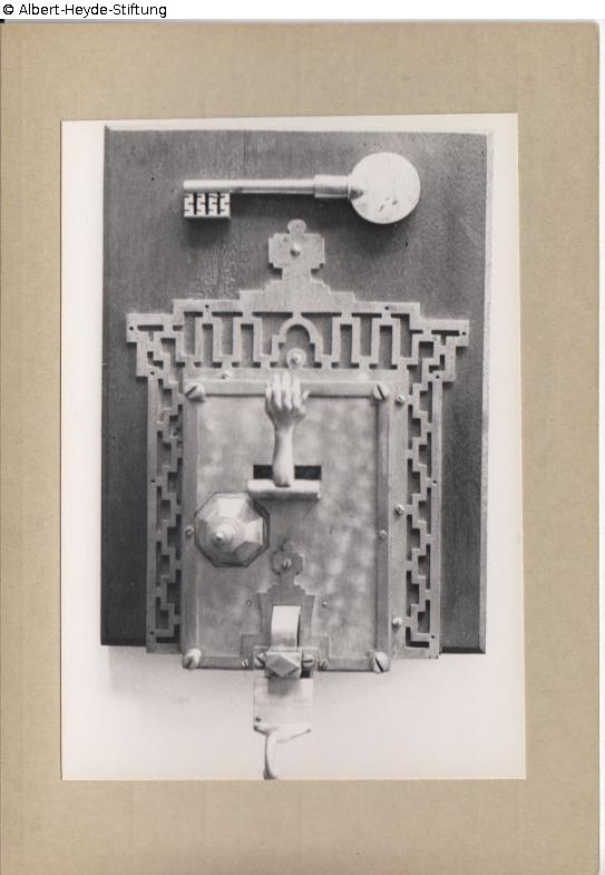 Kastenschloss, auf Holzplatte montiert, mit mäanderartig verziertem Beschlag und Schlüssel. Das Schlüsselloch wird durch einen beweglich montierten menschlichen Unterarm gesichert.