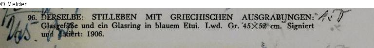„Von außergewöhnlicher Schönheit ist dieses auf einer weißen Tischdecke präsen-tierte Stilleben mit griechischen Ausgrabungsfunden. Ein leuchtendes Geschmeide mit Glassteinen in einem mit Samt ausgeschlagenen Etui sowie mit bunten Glasflaschen sind eine Augenweide impressionistischer Malerei“. (UW)