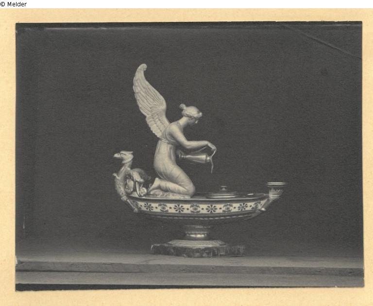 Schreibzeug in Form einer antiken Lampe. Ganz vergoldet, mit Purpurlinien und Sternornamenten verziert. Unterteil mit antikisierendem Stabmuster Obenauf eine kniende, langgewandete Frau mit aufgerichteten Flügeln, aus einer Kanne in das vor ihr eingesetzte Tintenfaß gießend.