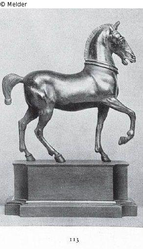 Mit kurzgeschnittener hoher Mähne und aufgebundenem Schwanz. Der Kopf, mit geöffnetem Maul und hochgestellten Ohren, ist ein wenig zur Seite geneigt. Auf der Stirn ein hochstehender Haarschopf. Um den Hals ist ein zweistreifiger Gurt gelegt. Nach einem der vier antiken Pferde an der Markuskirche in Venedig.