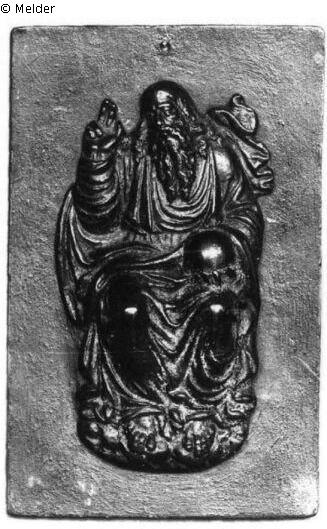 Rechteckige Plakette, hohl auf eine Platte gegossen, oben in der Mitte eine Durchbohrung, Gußfehler neben dem linken Knie. Gottvater ist sitzend in ganzer Figur dargestellt. Die rechte Hand hat er segnend erhoben, und in der linken hält er die Weltkugel. Unter seinen nackten Füßen sieht man Wolken.