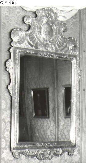 Silberspiegel mit ornamentiertem Profilrahmen mit Voluten Blattwerk und reußischem Wappen (Löwe und Kranich in gevierteiltem Wappenschild)
