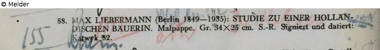 Ölstudie einer nach links sitzenden Frau, die ihre Haube aufsetzt. Dahinter eine weitere Studie dieser Frau mit stärker nach vorne geneigtem Kopf. In der oberen linken Bildhälfte zwei Kopfstudien, darunter die Halbfigur einer Frau mit einem Säugling auf dem Arm. Mit einer Widmung an den Kulturhistoriker Eduard Fuchs; signiert rechts unten mit Bleistift: Herrn Eduard Fuchs/Ihr/Max Liebermann. Links unten: Katwijk 82;