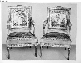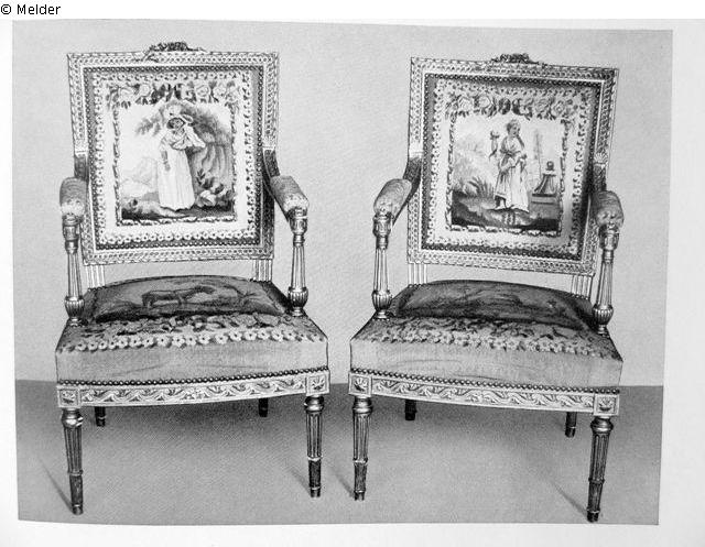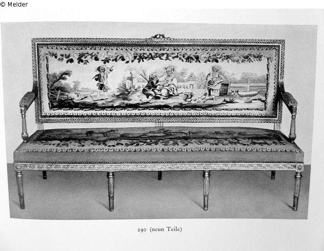 Vergoldete, reich geschnitzte Gestelle (neu). Mit Wolle und Seide gewirkte Aubussons-Tapisseriebezüge, auf den Lehnen in Blütenumrankung Einzelfiguren vor Landschaften, auf den Sitzen Tierdarstellungen. An den Rändern auf grünem Fond Blütenstäbe. Kanapee Länge 162cm, Höhe 94cm