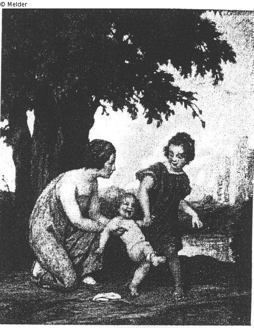 junge Mutter mit kleinem Mädchen und nacktem Kind; signiert