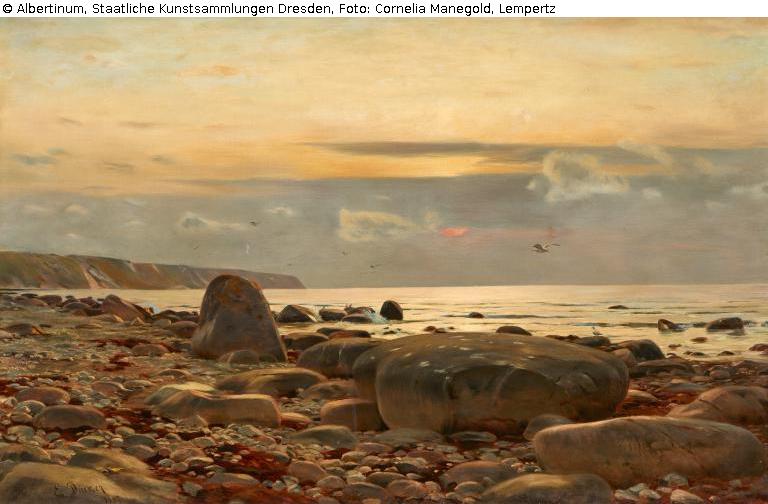 Bez. unten links: E. Drücker 1887. Vorn der Strand mit großen Steinblöcken, links die Küste, rechts die Ostsee. Nur Dünungswellen branden an den Klippen. Hinter einer grauen Nebelbank steht die rote Scheibe der aufgegangenen Sonne. Das Meer strahlt die Morgenhelligkeit silberweiß zurück. Nur Möwen beleben die Strandeinsamkeit.