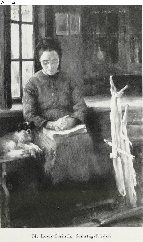Ältere Frau mit Hund, in Intérieur sitzend, daneben, Flachsgestell. Oben bezeichnet: Lovis Corinth 1887