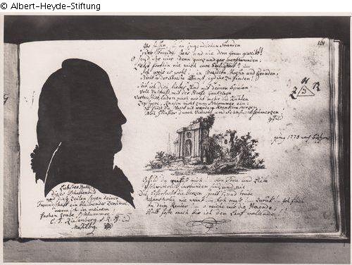 Eintrag des C. F. Riesenberg aus Mecklenburg mit dessen Brustbild als Schattenriss, dazu ein Gedicht und die Federzeichnung einer Ruine. Für Huth, rechts Ruinenlandschaft und Abschiedsgedicht in 3 x 6 Zeilen. Links Brustbild als Schattenriss des C.F. Riesenberg aus Mecklenburg für Huth, rechts Ruinenlandschaft und Abschiedsgedicht in 3x6 Zeilen. Mit dem Symbolum Z (?) H (Huth) R (Riesenberg) - [s. Foto]. Mit Notiz (von H) ging 1778 nach. Vgl.: [Inv.-Nr.] 242