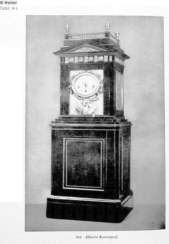 Furniert, mit reichen Goldbronzen. Auf viereckigem, profiliertem Sockel das schmale Uhrgehäuse mit Uhr- und Spielwerk. Das Zifferblatt mit der Bezeichnung "Roentgen & Kinzig a Neuwied" in einer matten Goldbronzeplatte; der runde Rahmen mit plastischen Blumen- und Fruchtgehängen bekränzt, wird von dem knienden Saturn getragen; die Schmalseiten mit Bronzegittern. Darüber Bronzegesims mit Triglyhenfries und Scheiben mit Köpfen. Im Giebel ein Relief mit zwei Amoretten. Als Abschluß Bronze-Balustergalerie mit vier Eckvasen. Neuwied.