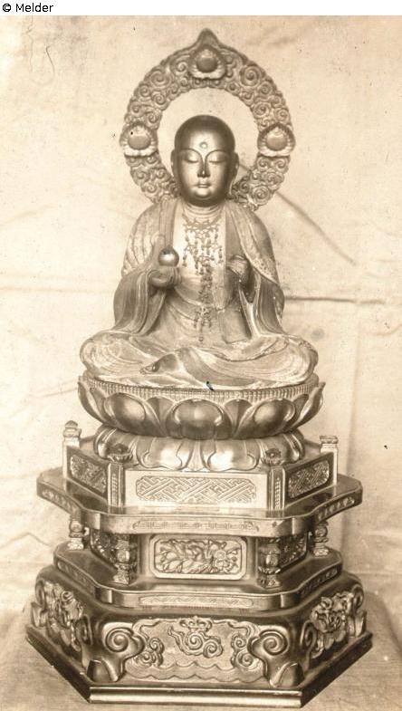 Buddha sitzt am Boden, in einer Meditation versunken; Urna; Kreole; in vorgestreckter rechten Hand hält er Juwel (Nyoi Hojn); in linker Hand Rasselstab (verloren); trägt Priestermantel; Gehänge über der Brust.