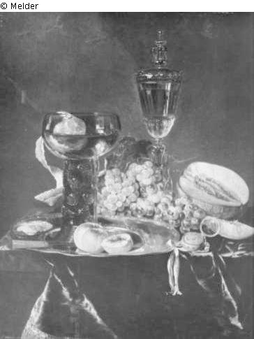 Tafelmalerei: Bild: Stilleben mit Pflanzen, Blumen und Früchten & Weinglas, Römer & Kelch & Armbanduhr, Taschenuhr; Stilleben; Pflanze; Blume; Frucht; Insekt & Glas; Römer (Pokal) & Kelch & Uhr