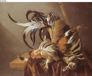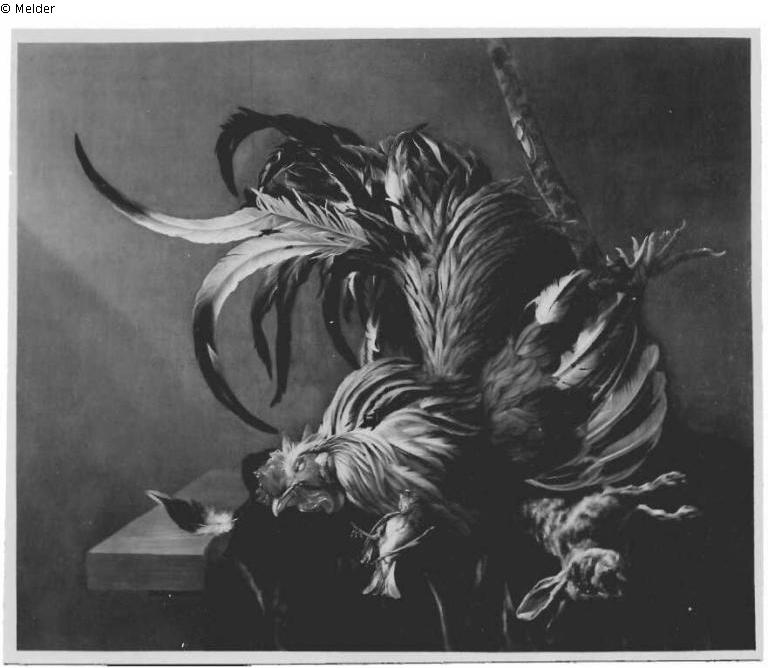 Stilleven met dode haan, dood konijn en vinkje / Stillleben mit totem Hahn, totem Kaninchen und Fink;