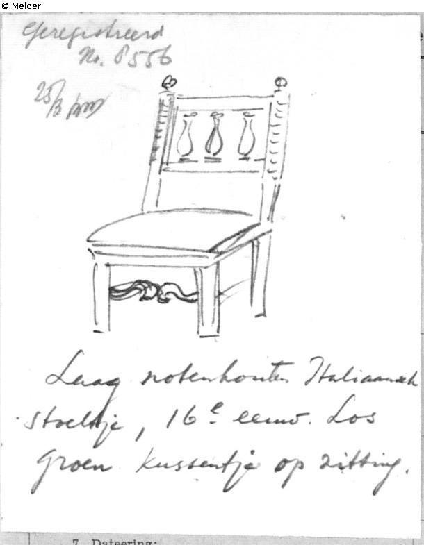 Quelle: Algemeen Politieblad van het Koninkrijk der Nederlanden, Jg. 95, Nr. 34, 30. November 1946 publizierten Liste 719 „Te ‘s-Gravenhage ontvreemd in 1943/1944, hollandsche teekeningen, t. w.“; Intern Aangifte Formulier vom 25.3.1946, BArch Koblenz B 323/2 fol. 152 mit eigenhändiger Skizze von F. Lugt;