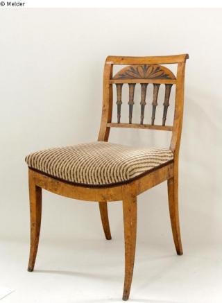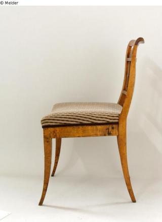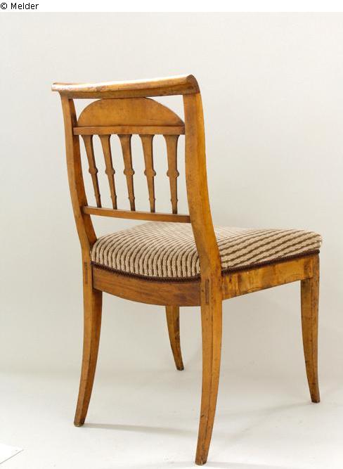 Polsterstuhl in Zargenbauweise. Die Stuhlbeine von einfachem quadratischem Querschnitt, nach unten verjüngt und ausgestellt. Die vordere und hintere Zarge nach unten gebogt, die seitlichen als einfache Streben. Die trapezförmige Sitzfläche gepolstert auf Gurten, mit blauer Seide bezogen. Die Rückenlehne einfach geschwungen, der obere Lehnholm nach hinten leicht eingerollt. Die Lehnfläche zweifach horizontal durch einfache Streben gegliedert. Im unteren Feld fünf flache Sprossen mit geschwungenen Kanten. Diesen entsprechend das auf der Schauseite in negativer Schwarzlotmalerei aufgebrachte Ornament aus Voluten erwachsenden stilisierten Eichenlaubes. Das obere, schmalere Feld mit flächigem Bogensegment gefüllt. Darauf in positiver Schwarzlotmalerei symmetrische vegetabile Ornamentik.