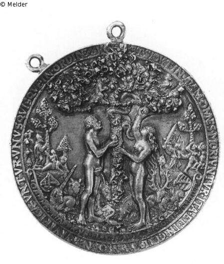 Medaille, dreifach gehenkelt (die linke Öse ist abgebrochen) mit Kette. Vs.: Adam und Eva stehen mit Äpfeln in den Händen unter dem Baum der Erkenntnis, um dessen Stamm sich die Schlange windet. Im Geäst sitzen ein Affe, ein Eichhorn und ein Hahn. Auf dem Boden hocken ein Einhorn, ein Ochse, ein Esel, eine Gans, ein Schwein, ein Hirsch und ein Hase. Seitlich erkennt man in kleineren Szenen die Erschaffung der Eva und die Vertreibung aus dem Paradies. Unten ein Spruchband mit IOANNS FRIDERICVS ELECTOR DVX SAXONIE FIERI FECIT, seitlich die sächsischen Wappenschilde. Am Baum wurde Blattwerk aufgelötet. Umschrift (teils in ligierten Buchstaben): ET SICVT IN ADAM OMNES MORIVNTVR ITA ET IN CHRISTVM OMNES VIVIFICABVNTVR VNVS QVISQVE IN ORDINE SVO. Rs.: In der Mitte erhebt sich das Kreuz Christi zwischen denen der beiden Schächer. Maria Magdalena umfaßt den Fuß des Kreuzes und Johannes stützt die zusammengesunkene Maria. Von links tritt ein Soldat mit Lanze heran, ein anderer bedroht mit der Keule den rechten Schächer. Der Hauptmann zu Pferde schaut zu Christus hinauf. Links im Hintergrund sieht man einen Reiter vor einer Kirche, rechts die Auferstehung Christi. Unten ein Schriftband mit SPES MEA IN DEO EST und darüber die Signatur HR (ligiert) und die Jahreszahl 1536. Umschrift (teils in ligierten Buchstaben und mit Abkürzungen): VT MOSES EREXIT SERPETE ITA CHRS IN CRVCE EXALTATVS ET RESVSCITATVS CAPVT SERPETIS COTRIVIT VT SALVARET CREDETES [Rosette] Die Medaille wurde nach dem Holzmodell (siehe Nr. 361) ausgeführt, aber mit einigen Veränderungen: Schriftbänder und Wappen sind gefüllt, Wolken wurden hinzugefügt und das Laubwerk und die fast vollplastische Figur Christi in der charakteristischen Manier Reinharts nachträglich aufgelötet. In der Kress Collection in Washington befindet sich ein bronzenes Exemplar.