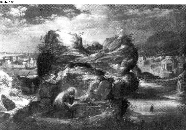 In a Landscape with large cliffs in the centre and a panorama of Jerusalem in the middle ground, several scenes from the saint¿s life. In the foreground under a cliff is Mary cutting off her braids. To the right is the scene of the death of Mary.
