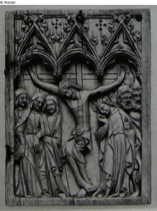unter drei gotischen Arkadenbögen Christus am Kreuz, weinende Frauen, Johannes und zwei Krieger