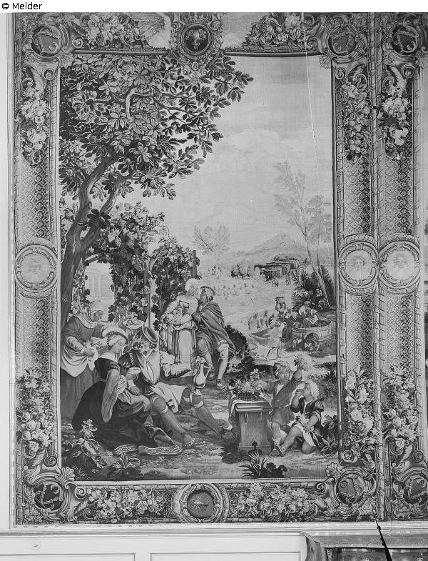 Bis 1942 im Residenzschloss Dresden, Kaisersalon (Gobelinsaal), Bärengartenflügel 2. OG; Mitte 1942 wurden die Gobelins (insgesamt 23 Stück, darunter die hier benannte Tapisserie) im Residenzschloss auf 8 Rollen gespannt und so in überwölbte Erdgeschossräume des Residenzschlosses transportiert; Im September/Oktober 1942 wurden die Rollen in das grüne Gewölbe verbracht (Kamin-, Juwelen- und Bronzenzimmer); Am 16./17. August 1943 erfolgt der Transport der 8 Rollen Gobelins nach Schloss Schleinitz, da eine Begutachtung am 8. Juni 1943 zu der Feststellung führte, dass die Räume im Grünen Gewölbe nicht ausreichend gegen Bombenangriffe geschützt sind; Ein Verlust im Zusammenhang mit den Ereignissen des 2. WK kann nicht ausgeschlossen werden (nach Aktenlage Verlust am Auslagerungsort).
