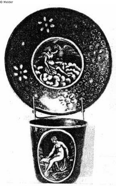 Rötlich schwarzer Grund. Drei Medaillons mit Götterdarstellungen in Grisaille. Die übrigen Flächen mit Goldschnörkelranken und farbigen Rosetten.