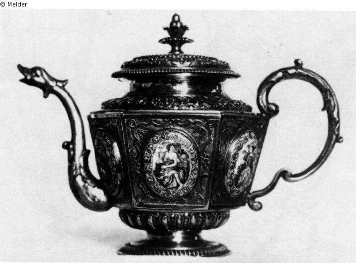 Sechsseitige Teekanne, verziert mit sechs ovalen, emaillierten Medaillons mit figürlichen Darstellungen. Zu Ahv 353 bis 364 gehörend (Koppchen und Unterschalen).
