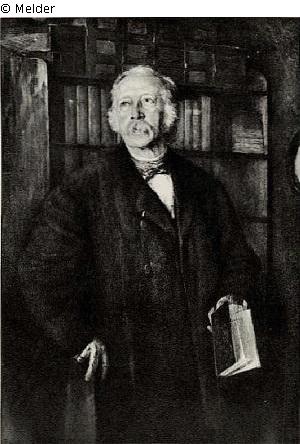 Der Dichter Theodor Fontane, in einem Langen schwarzen Rock, steht vor einer mit Bücherregalen bedeckten Wand, in der linken hand hält er ein Buch, die rechte Hand greift auf eine Stuhllene. Signiert und datiert '93. B. Goldener rahmen.