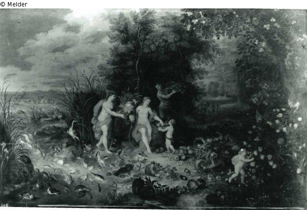 Zuerst von Poensgen verwechselt mit dem aus dem Nuenen Palais stammenden "Bacchusfest" von Jan Brueghel d. J. in der Berliner Gemäldegalerie.