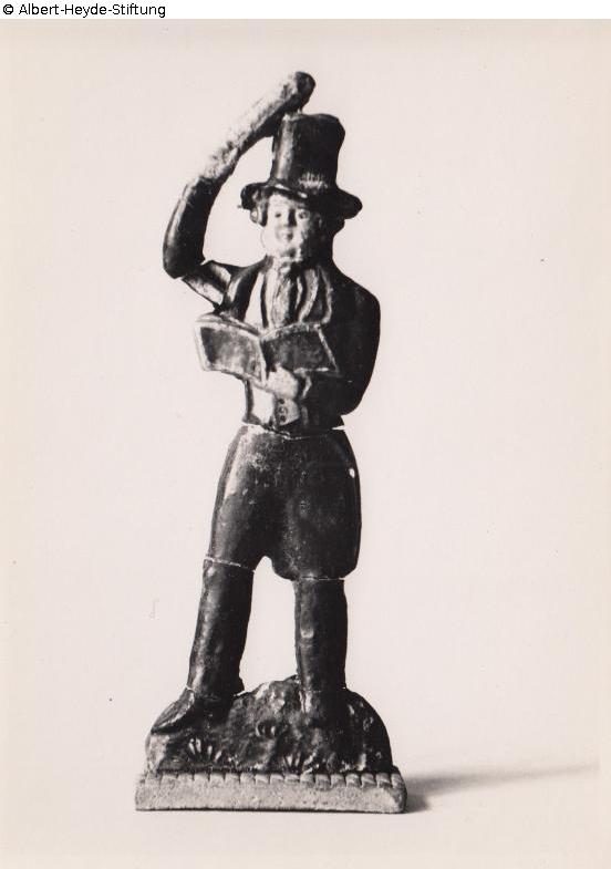 Halbplastische Figur eines dirigierenden Chorleiters in dunklem Rock mit Zylinder. Tragant ist ein gummiartig aushärtendes Harz.